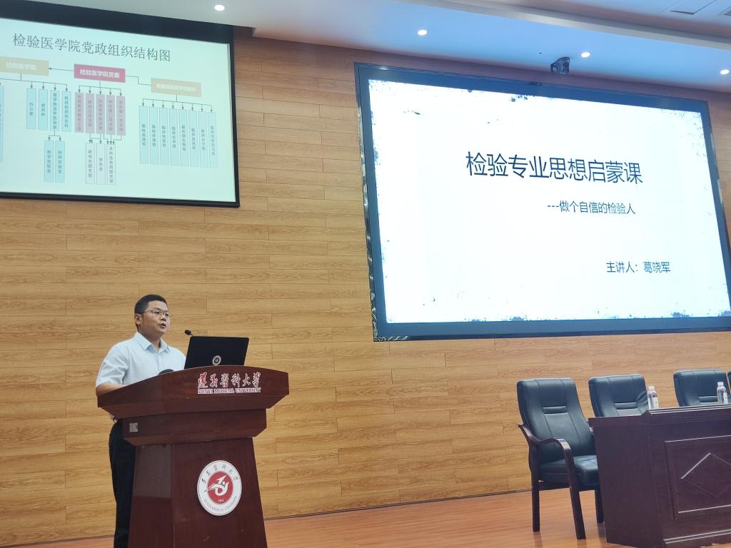 大会伊始,罗治宇副书记带领学院全体师生集体诵读毛泽东主席的《七律·长征》,感悟伟大长征精神。随后,周光润书记为2024级新生致欢迎辞。她勉励同学们要珍惜大学时光、积极进取、苦练本领、增长才干、勇敢追梦,努力成长为一名对社会有用的检验人才。学院副院长闵迅以《检验医学院的院科文化》为题给同学们讲授开学第一课,带领同学们了解遵医检验的历史传承和发展成果。第二附属医院检验科主任葛晓军则以自身的成长经历为同学们讲授专业思想启蒙课,鼓励他们积极投身于充满挑战和机遇的医学检验行业。