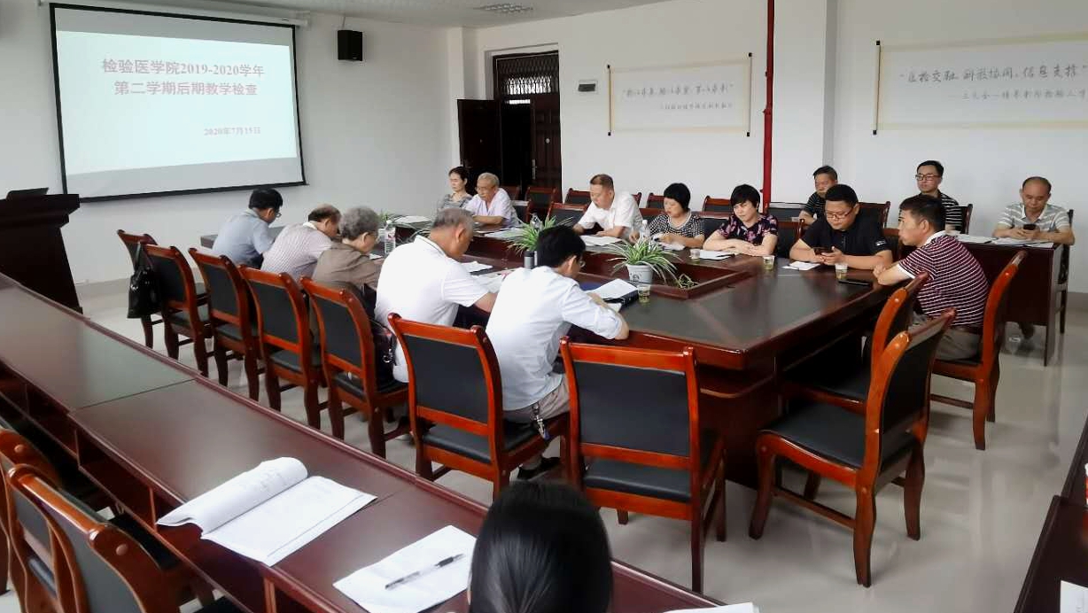 按照学校教务处《2019~2020学年第二学期后期教学检查工作》要求,为全面加强线上和线下教学质量监督与管理,全面评估本学期复课以来的教学效果;检验医学院于2020年7月9日-14日对所辖3个教研室开展教学自查工作。7月15日下午16:00,学校教学检查组钱民章教授、薛黔教授等一行5人到检验医学院进行后期教学检查。会议由钱民章教授主持,检验医学院领导班子、各教研室主任、秘书、课程组长及新蒲全体上班人员参加了此次后期教学检查工作。