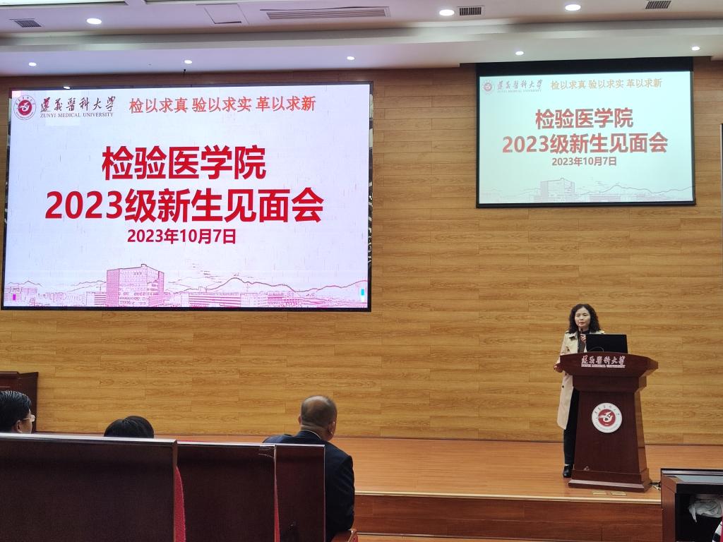 本次见面会中,周光润书记首先代表学院向全体2023级新生表示热烈欢迎,并希望他们能为检验医学院的发展注入更多的活力。闵迅副院长随后开展了审核评估学生教育培训,向同学们介绍了遵医历史、学科优势、科研成果、学生发展和人才培养成效。闵院长还从历史传承、组织架构、人才团队、教学环境及实施、科研及教学成果等方面对检验医学院科做了全方位的介绍。闵院长为大家动情讲述了遵医百名检验学子驰援贵阳抗疫的故事,希望同学们能继承遵医检验人不怕苦、有担当的精神。接着黄健博士为大家讲授开学第一课。黄健博士重点解读了专业培养方案,让学生全面了解医学检验技术专业的培养目标、研究方向、课程设置、学分设置、师资状况、办学条件等,用生动幽默的语言引导新生明确未来学习方向,更快树立学业目标,合理规划自身学习与生活。活动的最后由2020级保研同学石炫为大家做学习及保研经验的分享。