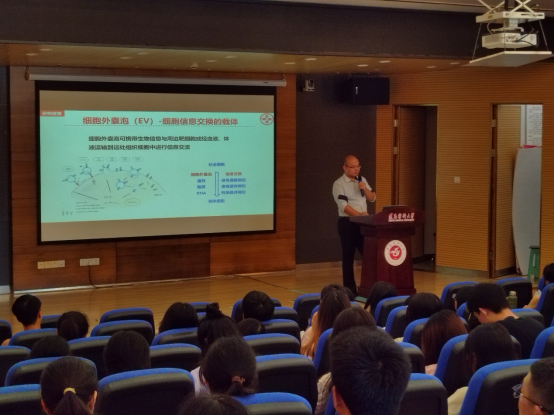 作为我院优秀毕业生代表,张晔博士时隔11年后重返母校。他首先简单介绍了自己,并主要以“细胞外囊泡核酸检测新平台构建及其临床应用转化”为题进行了50分钟的科研讲座;主要从:1)基于DNA框架表面局域化的EV(细胞外囊泡)核酸快速低成本分析技术;2)EV核酸原位检测技术;3)基于微流控技术进行EV单体检测技术等三个方向展开,详细介绍了各自的研究思路及应用和转化——整个讲座深入浅出、逻辑层次分明。随后张晔博士还讲述自己的求学经历,和大家一起回忆求学时的转变、热情工作与科研探索的艰辛。张博士从自己的学历开始讲起,从在遵义医科大学本科期间贪玩游戏到考研过程中幡然醒悟、从研究生阶段开始对科研、对学术研究热情高涨到南方医科大学读博期间就开始组建科研小组,逐步走向顶峰;从后进到新进、从平凡到不平凡,其中的科研热情、提前规划、努力奋斗可以从张博士介绍字里行间中透露出来,引人深思。尤其是张博士从本科阶段挂科生到现在教授级PI的学术成就与科研经历是他自己开心工作与热情生活的一部分,深深引起了本科生和研究生的共鸣与思考。