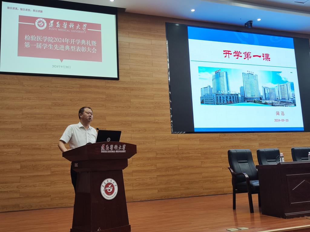 大会伊始,罗治宇副书记带领学院全体师生集体诵读毛泽东主席的《七律·长征》,感悟伟大长征精神。随后,周光润书记为2024级新生致欢迎辞。她勉励同学们要珍惜大学时光、积极进取、苦练本领、增长才干、勇敢追梦,努力成长为一名对社会有用的检验人才。学院副院长闵迅以《检验医学院的院科文化》为题给同学们讲授开学第一课,带领同学们了解遵医检验的历史传承和发展成果。第二附属医院检验科主任葛晓军则以自身的成长经历为同学们讲授专业思想启蒙课,鼓励他们积极投身于充满挑战和机遇的医学检验行业。