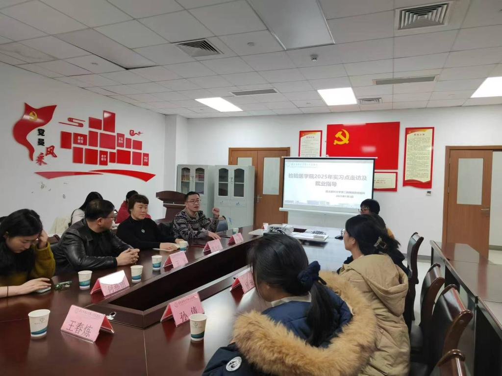 为全面了解实习生实习情况,传递学院对实习生的关怀,增进与实习单位的沟通交流,促进实习教学质量的同质化提升,赋能学生高质量就业。2024年12月26日和2025年1月3日,党委书记周光润先后带队赴第一附属医院检验科、第二附属医院检验科开展走访调研,召开座谈会,组织就业指导培训,走访学生宿舍等等。