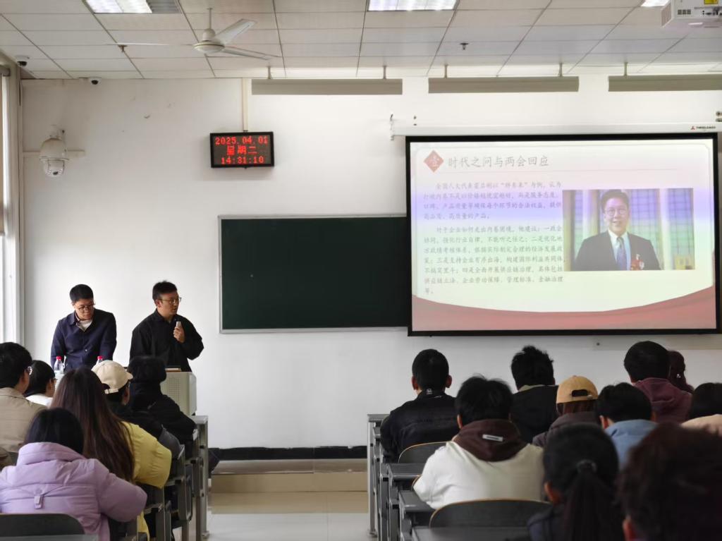 为深入学习贯彻习近平新时代中国特色社会主义思想,扎实推进党的创新理论"三进"工作,2025年4月1日,中共贵州省委党校讲师团成员、贵州师范大学马克思主义学院教授杨钧期、盛进洪同志赴遵义医科大学检验医学院,联合开展“理论‘黔言’·党校青年讲”(理论宣传二人讲)专题宣讲活动。活动以“打破内卷困局,重塑竞争新生态”为题宣讲2025年全国两会精神。学院党委书记周光润、副书记罗治宇、全体专职辅导员和22级学生共150余人参加活动。