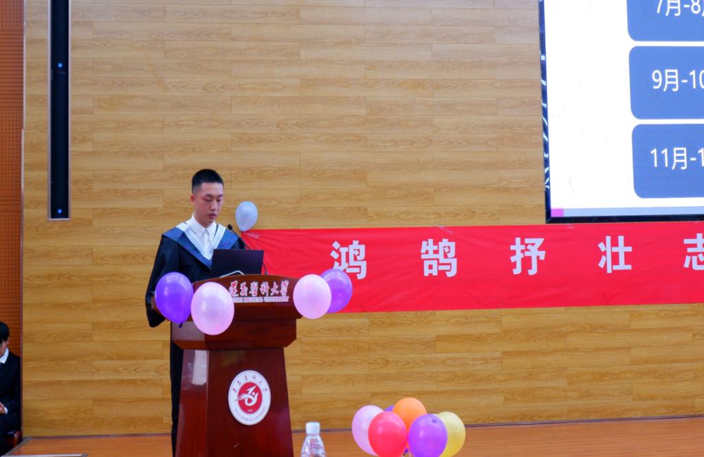 其次是优秀毕业生代表们发言,表达了对2022届毕业生美好的祝福和对未来的无限憧憬。随后,考研顺利上岸的学生代表进行现身说法,从如何准备、各门课程学习技巧,学习方法、时间安排、心理调节等方面做了经验分享;在校学生代表,通过小视频和现场表演等形式,对毕业年级的学长学姐们表达真诚的祝福。最后伴随着悠扬、抒情的歌曲,本次毕业典礼圆满结束。