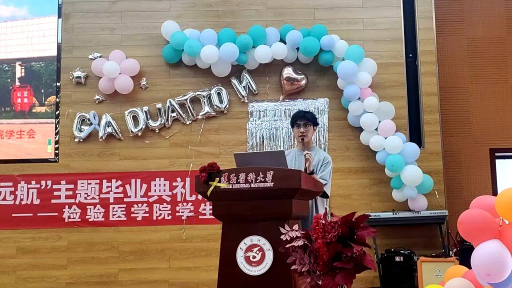 毕业典礼以学弟学妹们为2023届毕业生制作的毕业季祝福视频开场,紧接着的是检验医学院啦啦队的舞蹈表演。气氛活跃起来后,闵副院长致辞,首先闵院长肯定了2019级学子们在学习和工作上所取得的成绩,并向毕业生们提出自己的期望,希望同学们能在追寻自己梦想的路上砥砺前行。周光润书记讲到2023届毕业生们驰援贵阳抗疫,展现了遵医检验人不畏艰险、奋勇逆行、大爱无疆的担当精神,并表示盼望毕业生在百忙之中常回母校走走、常来检验看看,同时嘱托毕业生们一定要终生铭记“检以求真、验以求实、革以求新”的院训并将它发扬光大!两位领导字字句句都饱含温情,表达了对毕业生们的不舍与厚望。
