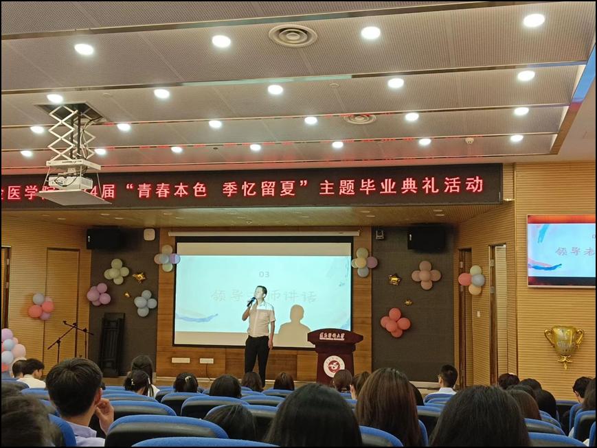 2024年5月31日,检验医学院以“青春本色,季忆留夏”为主题,在图书馆多功能厅举办了2024届本科生及研究生毕业典礼。检验医学院党委书记周光润、副院长闵迅(主持工作)、副院长杨艳、副处级组织员王东、蔡亮容主任、学院辅导员、部分授课老师及2020级全体毕业生参加典礼。