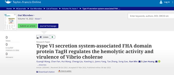近日,我校检验医学院闵迅、黄健教授团队以遵义医科大学为唯一完成单位,在国际肠道微生物领域知名期刊《Gut Microbes》(IF 10.245,中科院1区Top期刊)发表了题为“Type VI secretion system-associated FHA domain protein TagH regulates the hemolytic activity and virulence of Vibrio cholerae”的学术论文,硕士研究生王光丽和范婵为论文的共同第一作者,闵迅、黄健教授为论文的共同通讯作者。该研究成果得到国家自然科学基金、贵州省科技厅项目、遵义市科技局项目等经费支持。