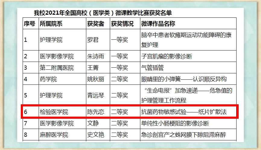 热烈祝贺检验医学院陈先恋老师作品《抗菌药物敏感试验——纸片扩散法》在此次参赛中荣获二等奖!