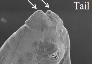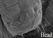 结膜吸吮线虫是隶属旋尾目(Spirurida)吸吮科(Thelaziidae)的吸吮线虫属。该类虫据记载已有33种,我国记载的有13种,吸吮线属的线虫主要为动物寄生虫,寄生于鸟类和哺乳类的泪管、瞬膜或结膜囊内。本文报道一名男性患者被含有结膜吸吮线虫感染期幼虫的果蝇飞入眼后造成感染。虫体细长约7mm,白色半透明,形似白线。通过在光镜下观察虫体的口孔边缘呈椭圆形,而在扫描电镜下呈六边形口囊,其发达呈角质性,无唇瓣,囊内壁有纵行和环形交错的细密皱纹。头端有6个呈索状突起的内环乳突,位于口孔各边外侧。肛门前后无乳突,在尾端腹面的两侧有一对馒头样的尾感器。除头部和尾端局部体表环纹不明显外,其余体表皆被由角皮形成明显的环纹、扫描电镜下可见带状的环纹呈叠瓦状排列。通过以上特征初步确诊该感染虫体为结膜吸吮线虫雌虫,随后通过测序得以证实。