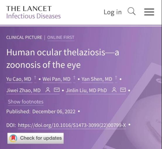 近日,我校检验医学院曹喻副教授以遵义医科大学附属医院为第一完成单位,遵义医科大学为第二完成单位,在国际传染病领域顶级期刊《The Lancet Infectious Diseases》(IF71.421,中科院1区Top期刊)发表了题为“Human ocular thelaziosis-a zoonosis of the eye”的学术论文。