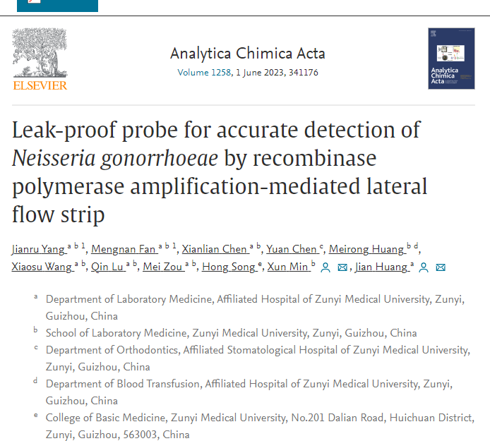 近日,遵义医科大学检验医学院闵迅、黄健教授团队在国际化学类知名期刊《Analytica Chimica Acta》(中科院1区,IF:6.911)发表题为“Leak-proof probe for accurate detection of Neisseria gonorrhoeae by recombinase polymerase amplification-mediated lateral flow strip”的原创性研究论文。检验医学院杨建儒老师、硕士研究生范梦楠为共同第一作者,闵迅教授、黄健教授为共同通讯作者。