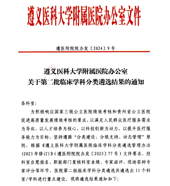 为积极响应国家三级公立医院绩效考核和贵州省公立医院促进高质量发展绩效考核的要求,以满足人民群众医疗服务需求为导向,以人才培养为核心,以科技创新为动力,以提升医疗服务能力为目标,坚持遵循“分类建设、分级支持、动态管理”原则,根据《遵义医科大学附属医院临床学科分类遴选管理办法(2023年修订)》(遵医附院院办发〔2023〕77号)文件要求,经科室自愿报名、职能部门复核科室业绩、专家函评、现场答辩专家评分等环节,医院第二批临床学科分类遴选共遴选出11个科室/学科进行重点建设。