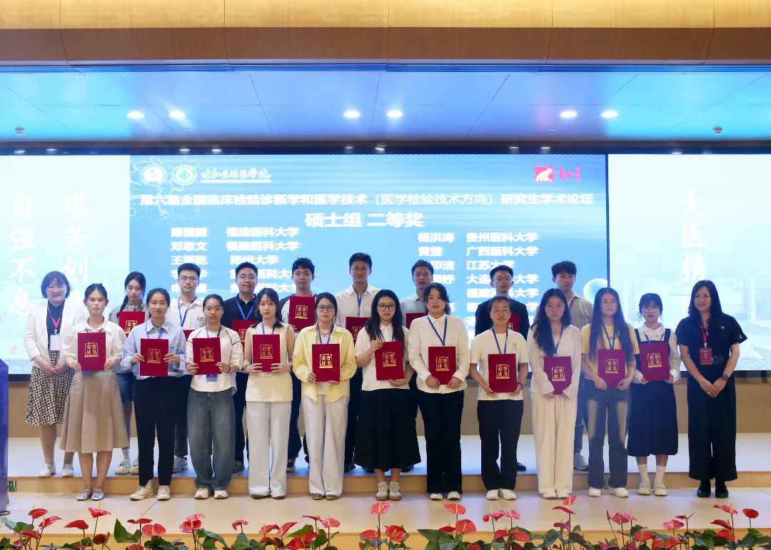 硕士研究生分论坛汇聚全国各知名高等院校百余位优秀学子同台竞技。参赛选手以饱满昂扬的精神风貌为底色,凭借视角新颖的选题设计和方法独到的学术探索,呈现了一场场思维碰撞、精彩纷呈的学术盛宴。其中我院临床检验诊断学专业硕士研究生胡华琴就《融合魏斯氏菌 RY-1调控DSS诱导的UC小鼠的效应和机制研究》、刘洲亨就《LASS2 通过与 MDM2/MDMX 的相互作用增强 p53 蛋白的稳定性和核易位进而抑制肝癌进程的研究》、彭艳凤就《霍乱弧菌 ZapA 蛋白在菌体分裂过程中的作用研究》、马永红就《车前草多糖通过结合半乳凝素-1抗宫颈癌活性的研究》、黄小雨就《DegS 蛋白酶通过 CdgH-VpsR途径调控霍乱弧菌生物被膜形成的机制研究》、李明哲就《巴西苏木素通过抑制hla的分泌从而降低MRSA的毒性和致病性》、杜洁就《LASS2 通过 NDUFS2-UQCRFS1-ATP5A 轴诱导线粒体能量代谢崩溃抑制三阴性乳腺癌的机制研究》进行了专题汇报并对专家提出的问题进行作答。颁奖环节中,专家组特别肯定了我校学子三大优势:研究设计科学严谨、数据支撑坚实可靠、答辩陈述逻辑清晰。其中,杜洁和李明哲斩获特等奖;胡华琴、刘洲亨、彭艳凤荣获二等奖;马永红、黄小雨获得三等奖。