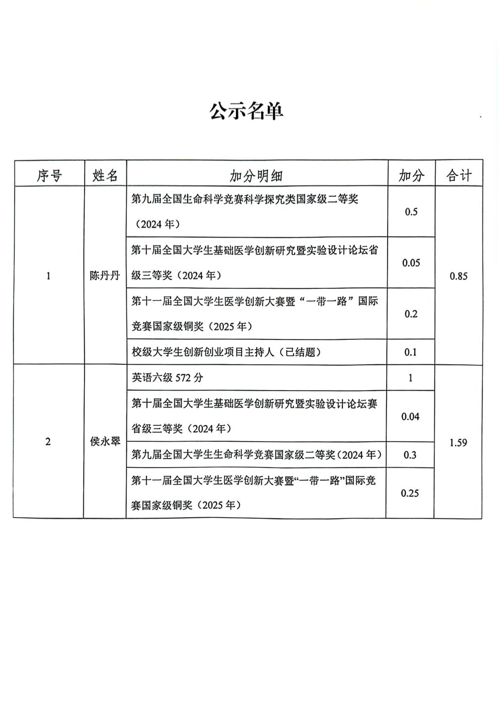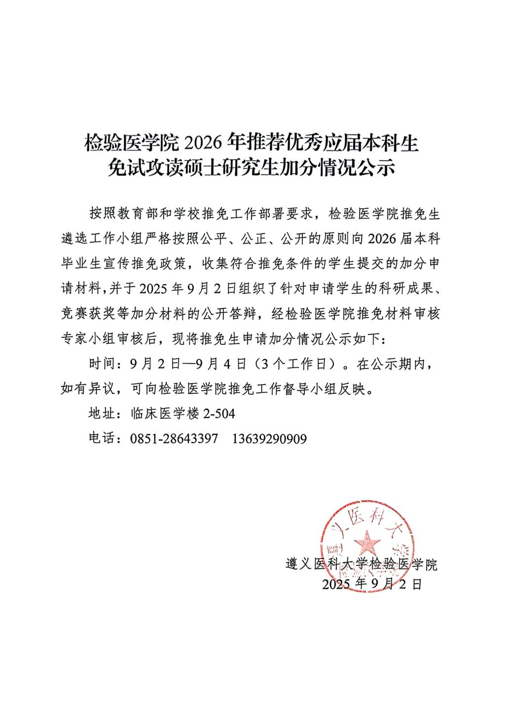 按照教育部和学校推免工作部署要求,检验医学院推免生遴选工作小组严格按照公平、公正、公开的原则向2026届本科毕业生宣传推免政策,收集符合推免条件的学生提交的加分申请材料,并于2025年9月2日组织了针对申请学生的科研成果、竞赛获奖等加分材料的公开答辩,经检验医学院推免材料审核专家小组审核后,现将推免生申请加分情况公示如下: