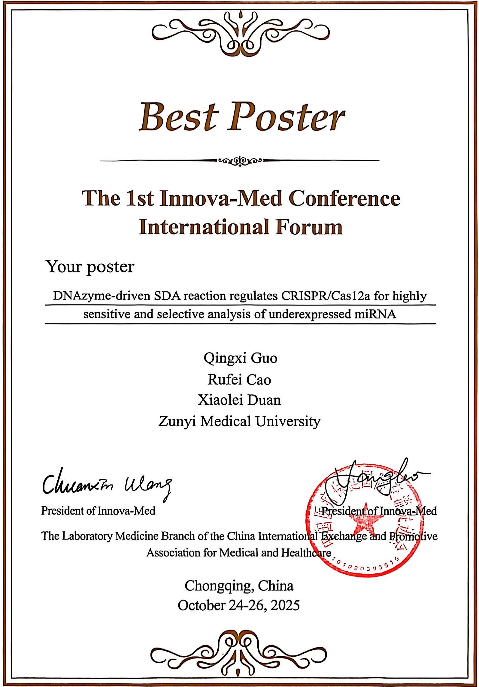 10月24日至26日,由Innova-Med协会主办的首届Innova-Med国际会议研究生学术论坛在重庆隆重举行。本次论坛作为医学检验技术与分子诊断领域的一项重要国际学术活动,致力于为全球研究生构建高层次的交流平台,聚焦行业前沿动态与发展趋势展开深入探讨。