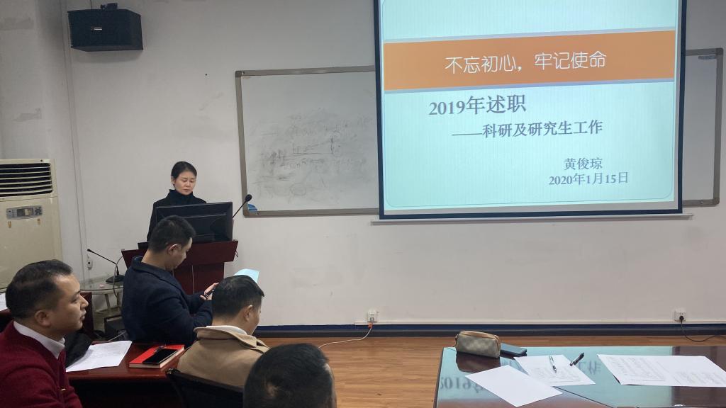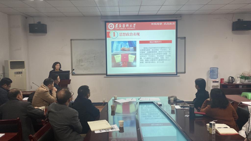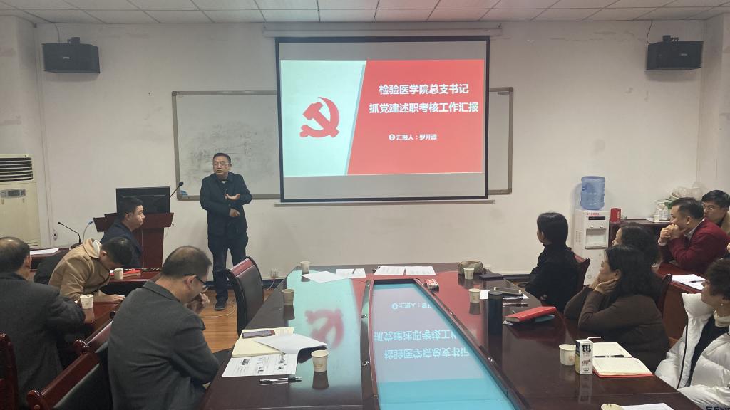 2020年1月15日下午,检验医学院在大连路门诊六楼会议室召开2019年处科级干部述职评议报告会。学院党委书记罗开源、副院长闵迅、副院长黄俊琼、办公室主任蔡亮容、实验室主任胡永林、检验科党支部书记兼临床微生物免疫检验教研室主任陈泽慧、临床生物化学检验教研室主任鄢仁晴、临床基础检验与血液检验教研室主任葛晓军、学生第一党支部副书记郑国波、学生第二党支部副书记王伟、检验部门工会主席董泽令、辅导员付裕参加述职,医学检验科、输血科、院系教师共48人参加评议打分。会议由办公室主任蔡亮容主持。