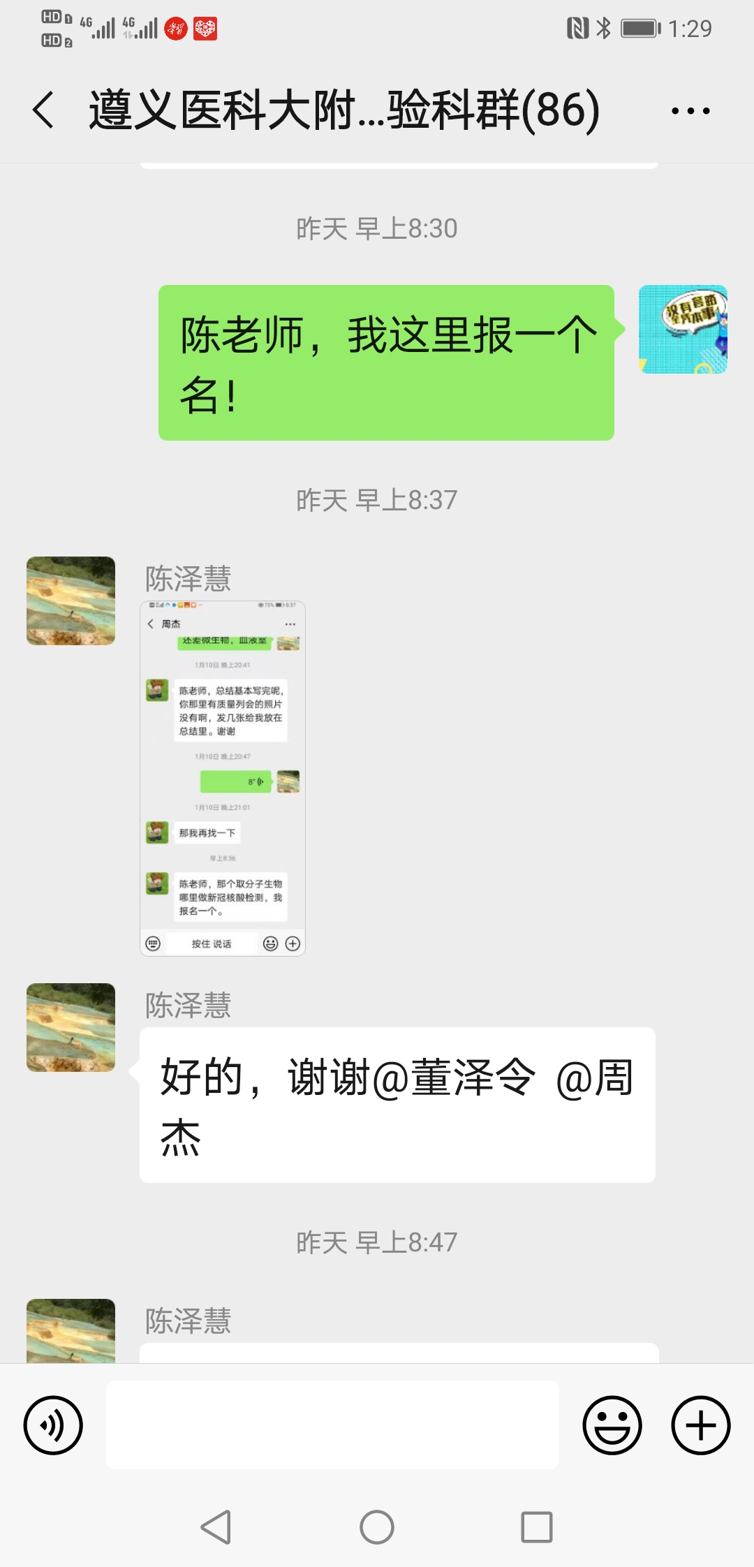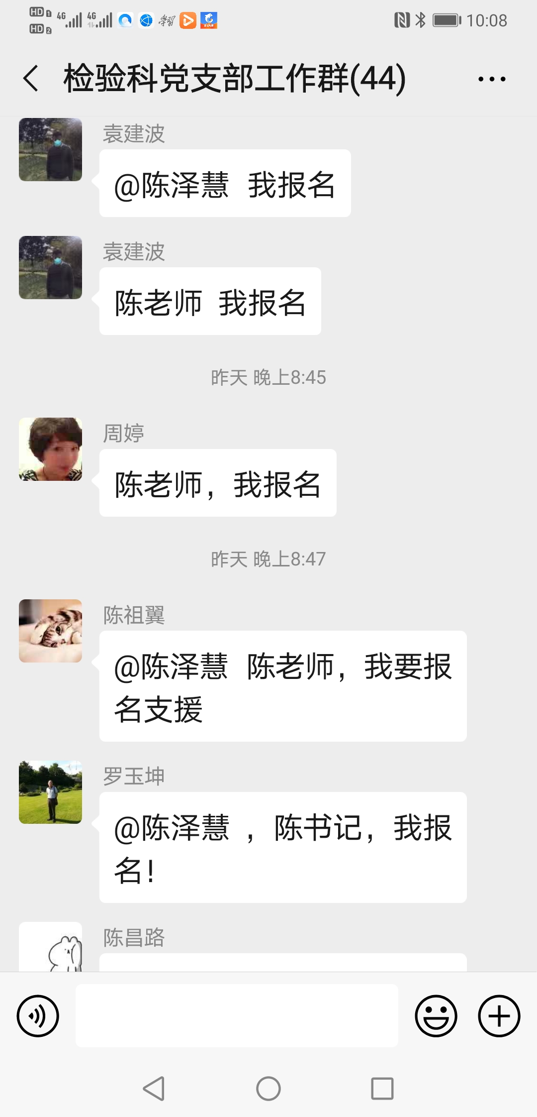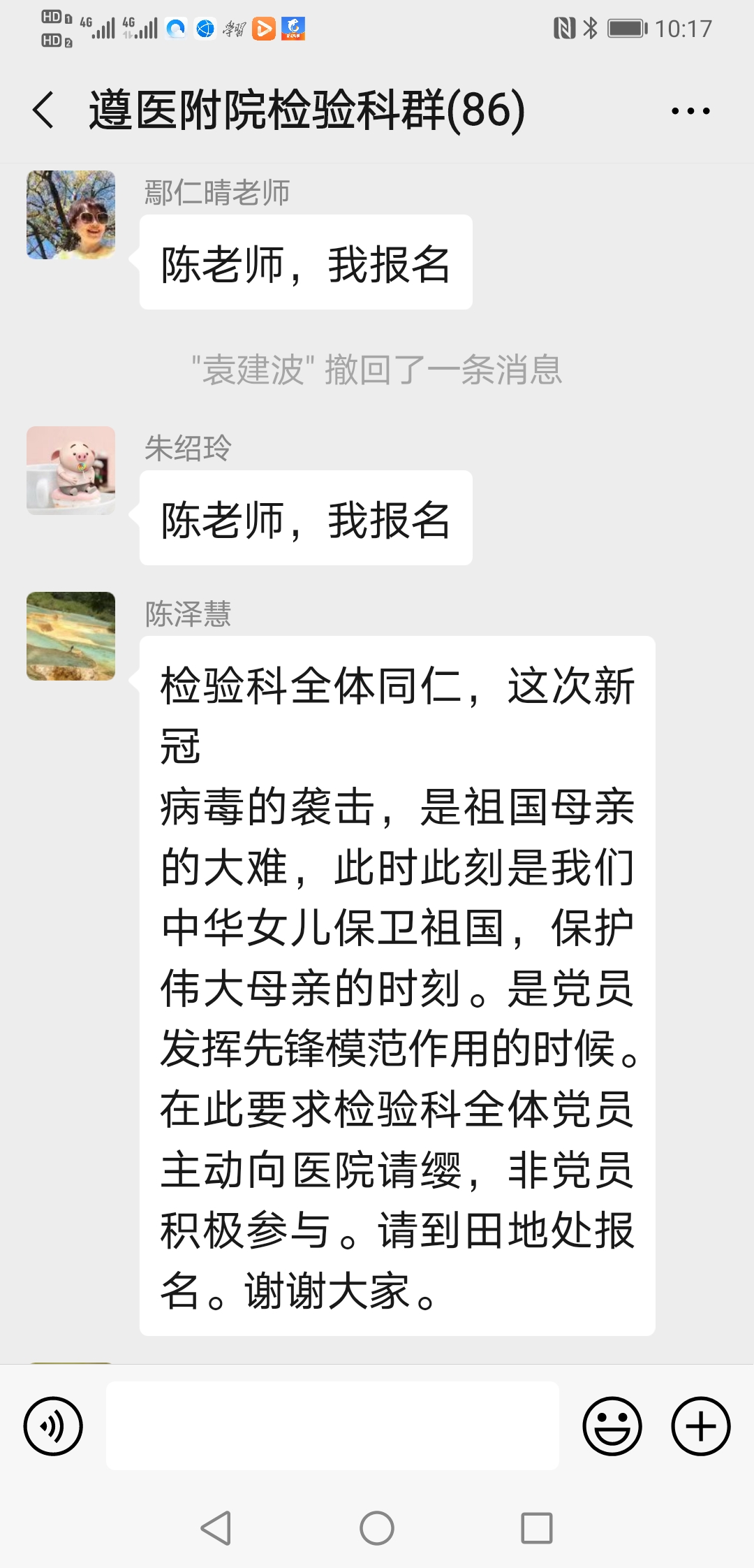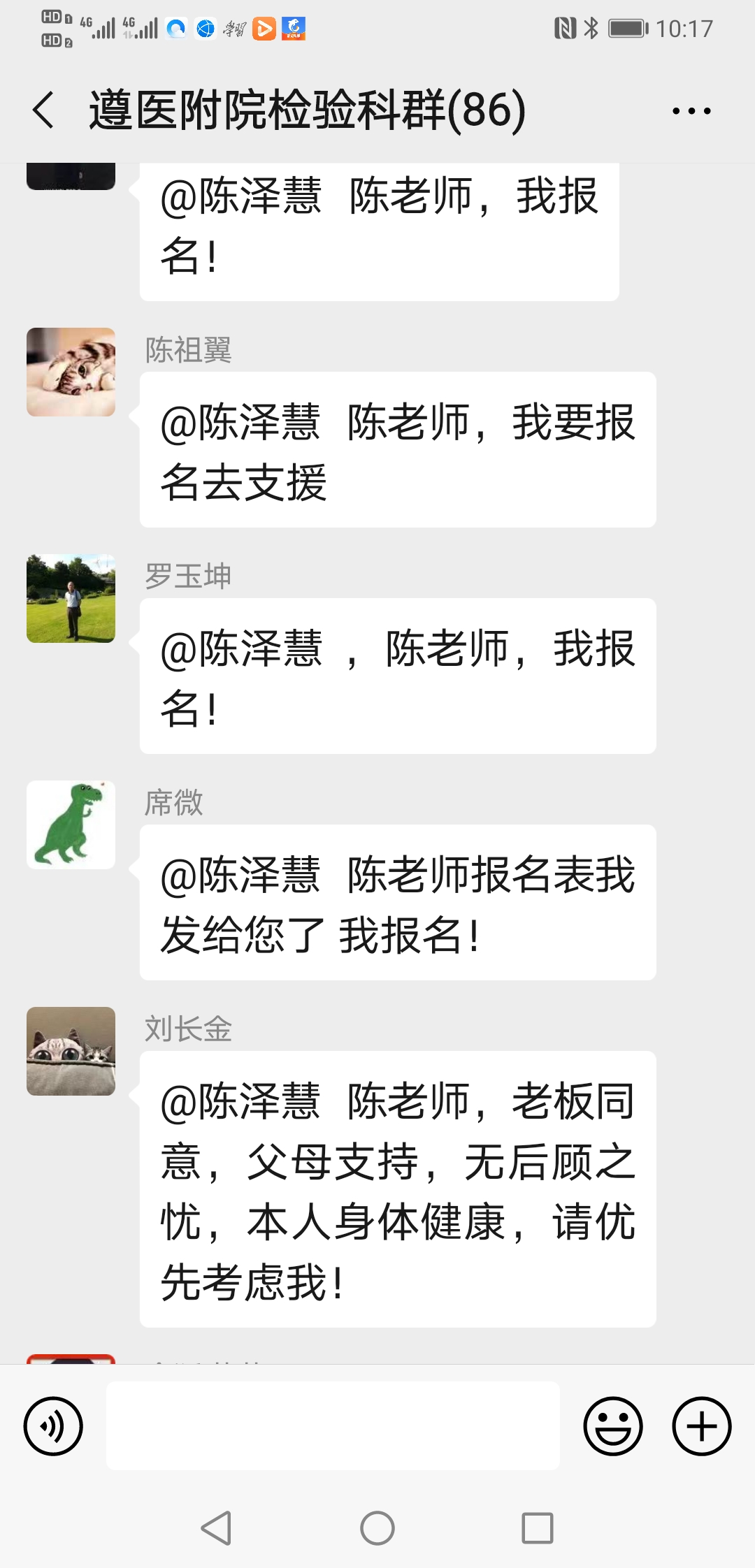 ……@陈泽慧 陈老师 我家还有兄弟姐妹照顾,我现在也没成家,也没娃娃,也没有后顾之忧,也是男生,且身强力壮,轮转过发光、生化和整个临检,况且临床大部分内科我都轮转学习过;也是新党员,国家有难,匹夫有责,希望领导们考虑我去吧!