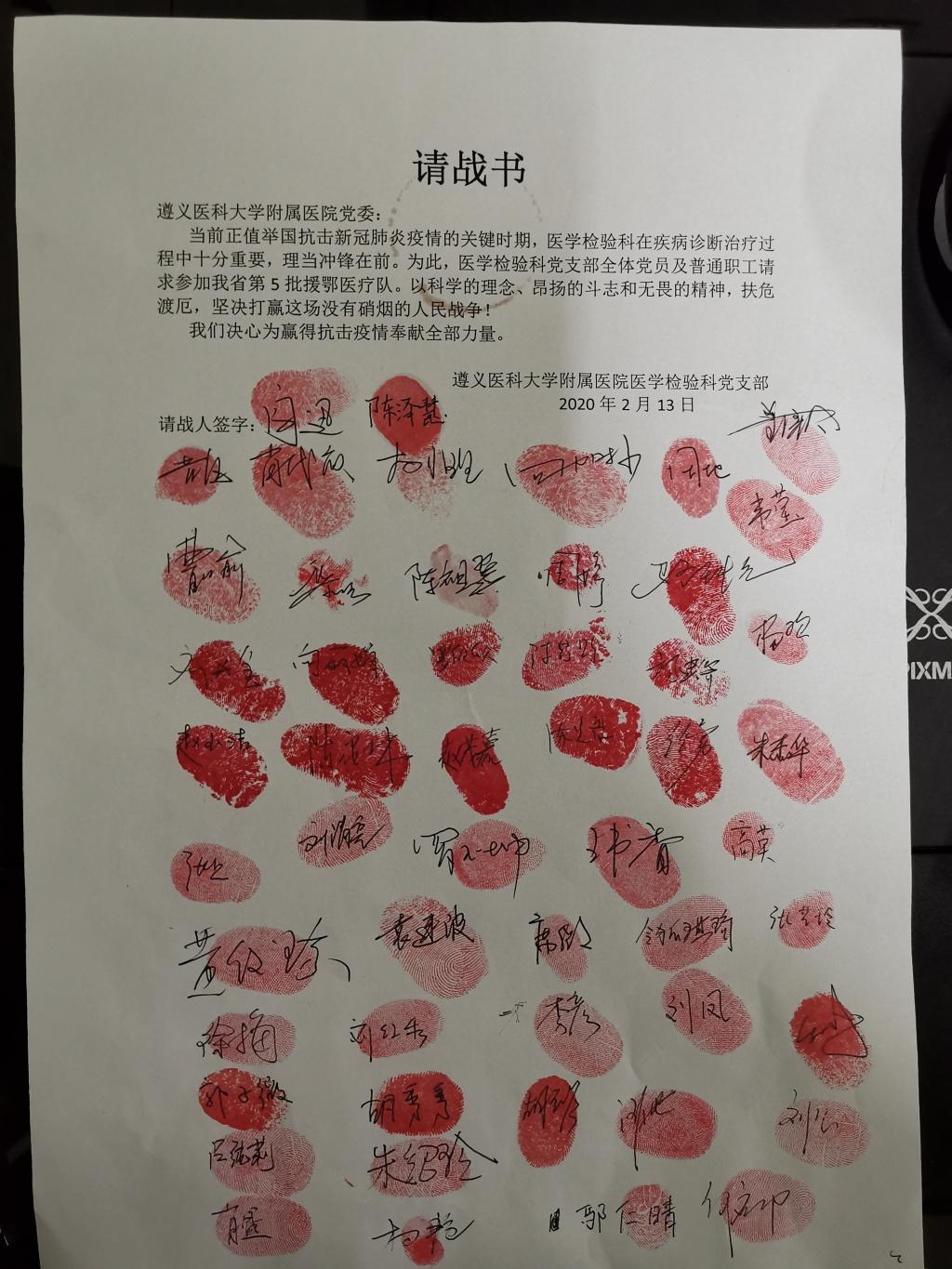 疫情当前,全国各地的医护工作者一夜之间化作“白衣战士”,义无反顾,用生命守护生命。面对愈加严峻的疫情,遵义医科大学附属医院医学检验科全体党员同志及干部职工,满脑子想的都是入职时许下的南丁格尔誓言,纷纷主动请缨参战,为抗击疫情贡献力量。在院党委的号召下,检验科党支部于2月13日,向院党委递交上了一份封印着50余个党员干部及非党员同志红手印的请战书。