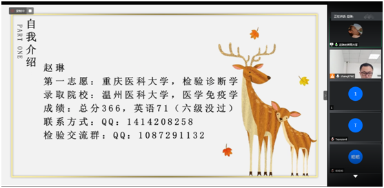 本次会议由张涛老师主持,邀请了四川大学2020级博士研究生石彬、重庆医科大学2020级临床检验诊断学专业硕士研究生张露、温州医科大学2020级医学免疫学专业硕士研究生赵琳和遵义医科大学2020级检验诊断学专业硕士研究生李仪晴作了主题交流,同时本院医学检验技术专业2017级部分同学参加了本次会议。四位受邀同学围绕“本专业学生第一志愿考取本校本专业研究生的经验及考研的必要性、本专业学生第一志愿考取外校本专业的经验、考取外校其他专业及调剂经验、考博的经验及对人生发展的重要性”为主题,介绍了自己复习备考的流程、心态、学校及专业的选择,同时也分享了自己复习资料的选择,各科的复习方法与时间安排。在互动环节中,许多备考同学也就自己在准备考研过程中所遇到的困惑与受邀同学进行了深入交流。