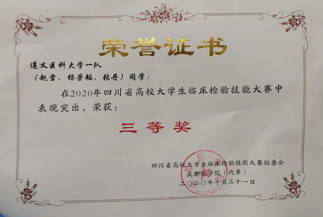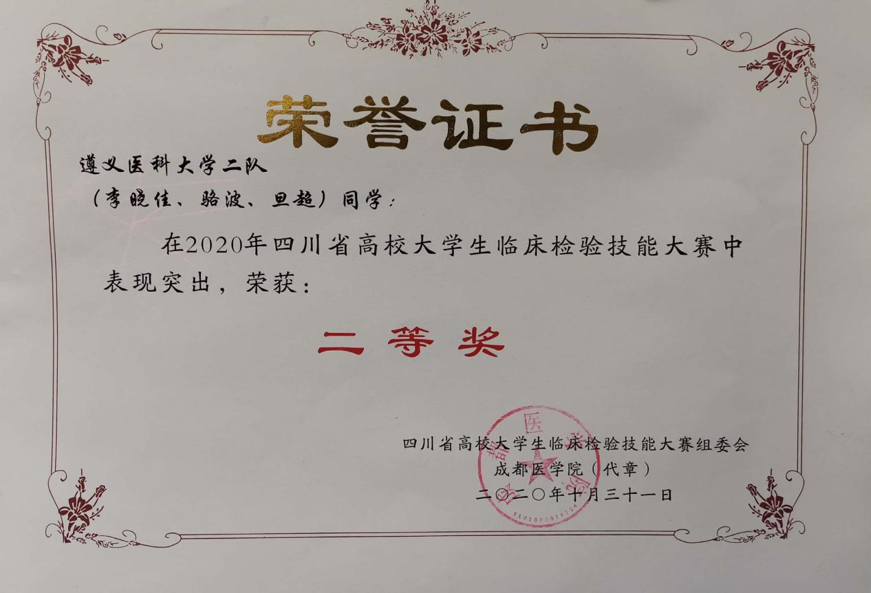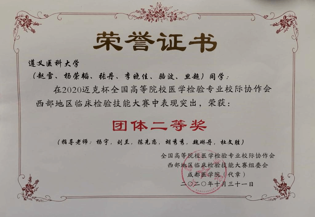 赛事准备以来,我院领导高度关心和重视此次大赛,赛前由闵迅副院长组织相关专业具有丰富临床经验的魏琳丹、陈先恋、袁瑾、刘兰、杜文胜、杨小理、曹喻、段晓雷、胡秀秀、杨宇等老师成立指导教师团队,积极开展参赛队员筛选、培训和考核工作。最终选派6名大学生队员参赛,分三人一组,共两组,并在大赛中荣获团体二等奖的佳绩。此外 ,二队队员骆波、李晓佳、旦超3名同学荣获四川省高校大学生临床检验技能大赛二等奖;一队队员赵雪、杨荣韬、张丹同学荣获四川省高校大学生临床检验技能大赛三等奖。以赛促学,我校参赛团队继上次赛事后,成绩更进一步,充分体现出了我院对医学检验技术专业大学生技能训练的重视,也标志着我院教师团队的教育教学质量在一步步的提升。