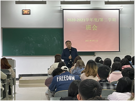 首先陆超老师就新学期学生管理工作提出要求,一是继续做好疫情防控工作,各班要落实日报告制度,以饱满的精神迎接新学期的学习和生活;二是强调校园安全,遵守校规校纪,树立良好的安全意识和自我保护意识;三是要养成自主学习的主动性和自觉性;四是特别强调四六级英语考试的重要性,并要求同学们要积极备战本学期四级英语考试。