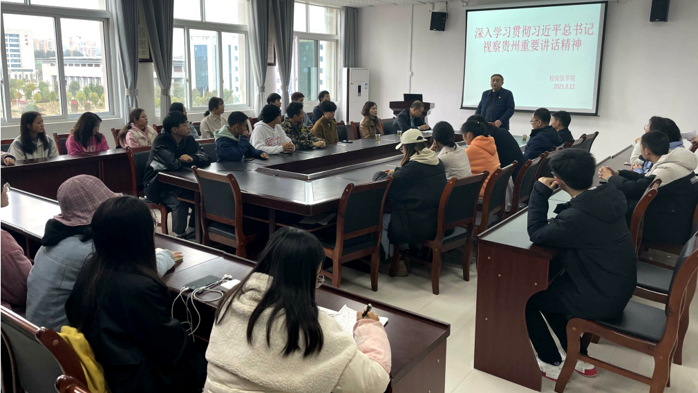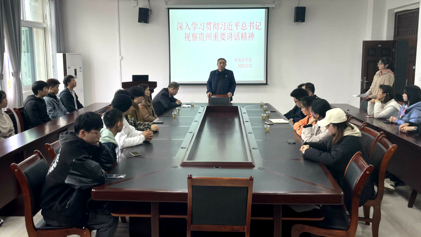 检验医学院于2021年3月12日中午12点,在检验医学院会议室开展了“习近平总书记视察贵州重要讲话精神”的宣讲工作。检验医学院高度重视,院党委书记罗开源、副院长闵迅、新蒲全体上班教职工、学生党支部及其团委、学生会学生代表参加了此次宣讲活动。