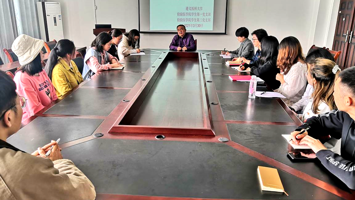 2021年3月30日遵义医科大学检验医学院学生党支部在新蒲校区2号实验楼五楼会议室开展党史学习教育和“牢记殷切嘱托、忠诚干净担当、喜迎建党百年”专题教育会。检验医学院书记罗开源,学生第一党支部副书记陆超,学生第二党支部副书记付裕及全体学生党员参加此次教育会。
