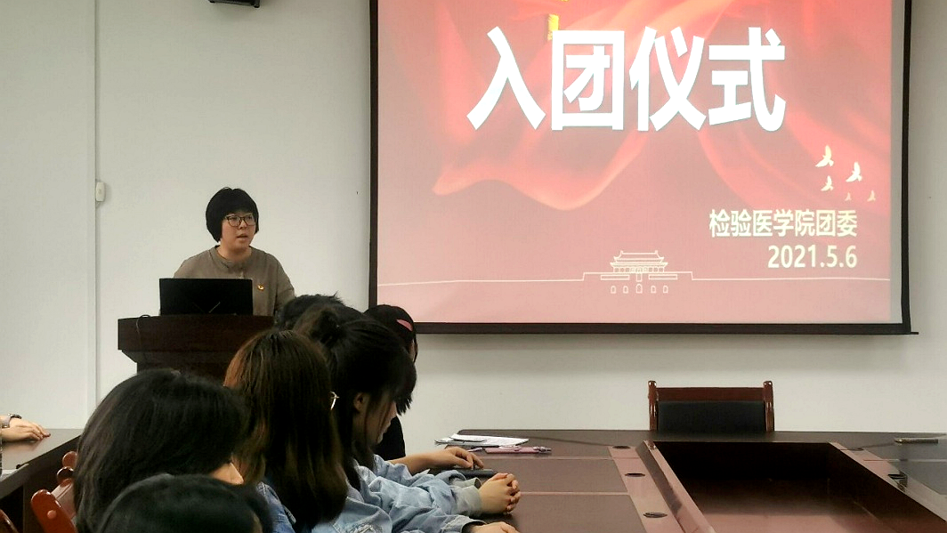 2021年5月6日14:30,检验医学院团委于院部会议室隆重举行了以“青春心向党·建功新时代”为主题的2021年春季新团员加入《中国共产主义青年团》入团仪式活动。检验医学院团委副书记付裕、团委全体成员、各年级老团员代表及新团员近40人参加入团仪式。活动旨在深入学习贯彻党的十九届五中全会精神,并进一步规范和深化入团仪式教育,突出入团仪式教育感召作用。