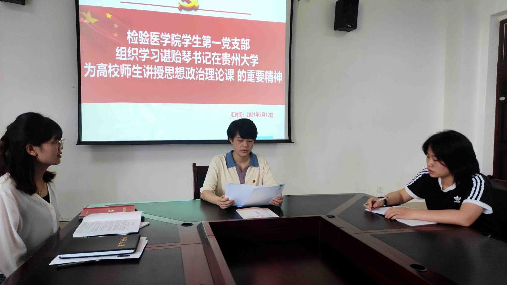 2021年5月12日下午4:00,检验医学院学生第一党支部在检验医学院会议室开展了学习谌贻琴书记在贵州大学调研并为高校师生讲授思想政治理论课的专题学习会。
