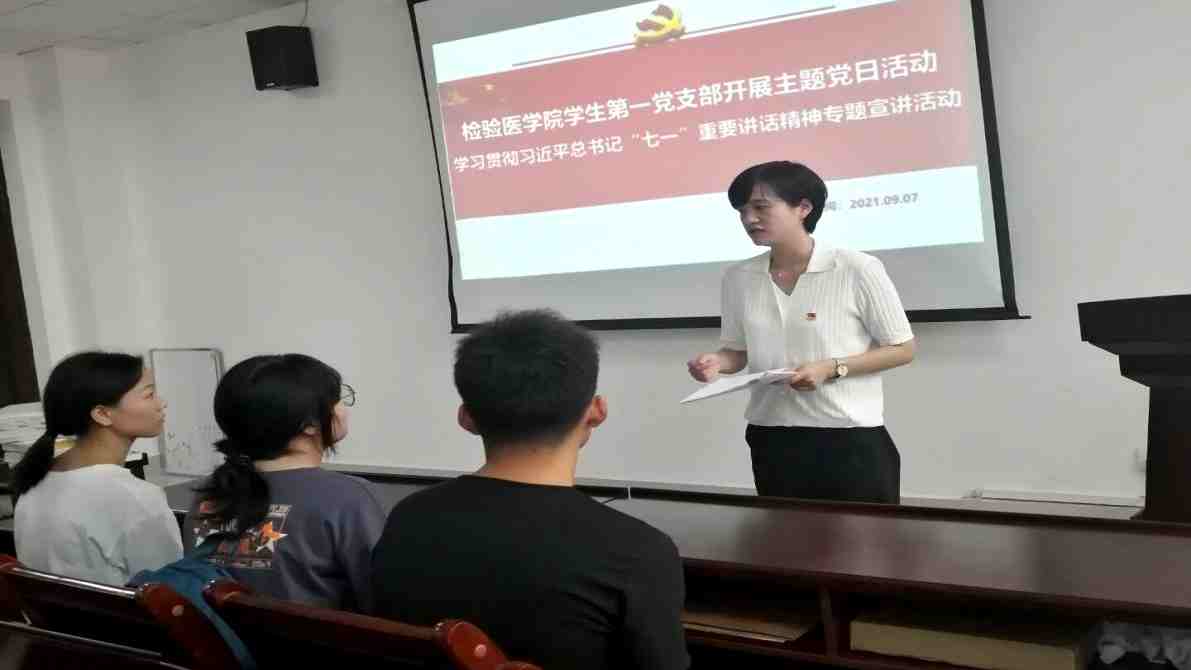2021年9月7日下午18点,检验医学院学生第一党支部在检验医学院学术报告厅开展了学习贯彻习近平总书记“七一”重要讲话精神的宣讲活动(一)。会议由检验医学院学生第一党支部副书记陆超主持。