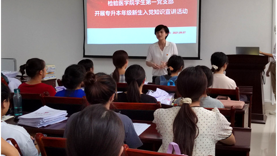 2021年9月7日17点,检验医学院学生第一党支部在检验医学院学术报告厅开展了专升本年级新生入党知识宣讲活动。会议由检验医学院学生第一党支部副书记陆超主持,党支部组织委员谌孙美及60名2019级专升本新生参加。