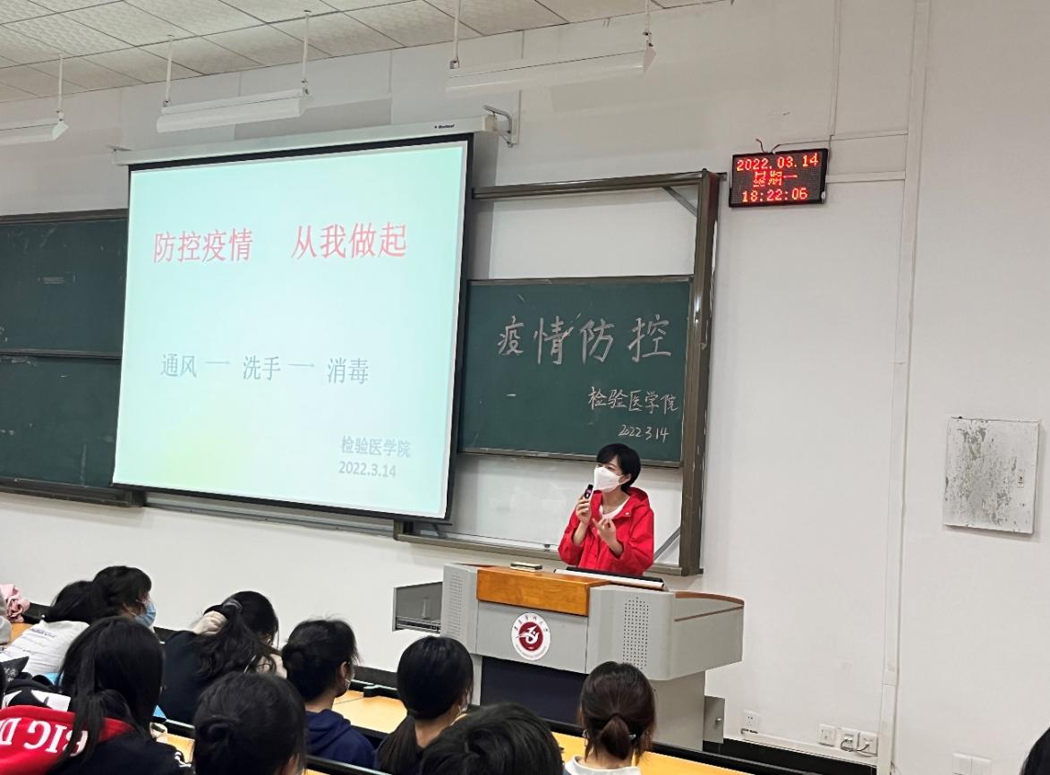 为进一步筑牢校园疫情防控的安全屏障,保障同学们的生命健康,2022年3月14日18:00,检验医学院2020、2021级在遵义医科大学新蒲校区第二教学楼第一阶梯教室开展了疫情防控安全教育宣讲会。会议由年级辅导员陆超老师主持,2020、2021级全体学生参加此次宣讲会。