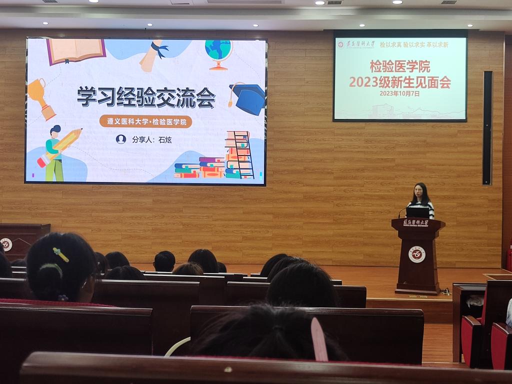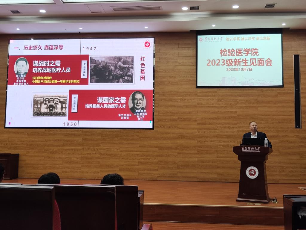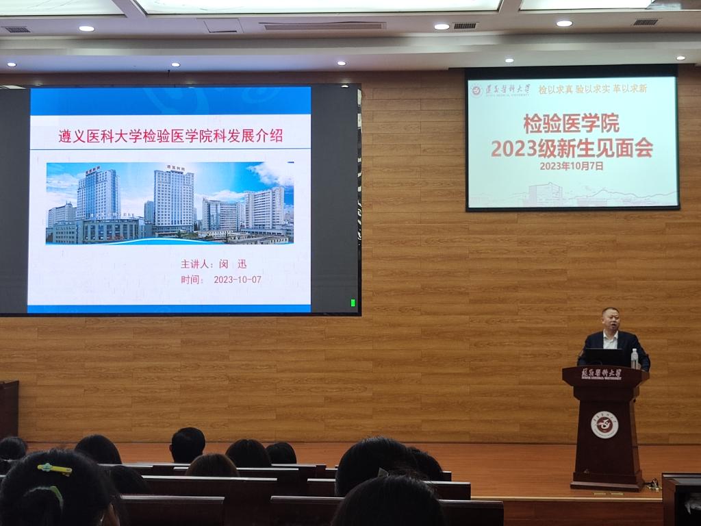本次见面会中,周光润书记首先代表学院向全体2023级新生表示热烈欢迎,并希望他们能为检验医学院的发展注入更多的活力。闵迅副院长随后开展了审核评估学生教育培训,向同学们介绍了遵医历史、学科优势、科研成果、学生发展和人才培养成效。闵院长还从历史传承、组织架构、人才团队、教学环境及实施、科研及教学成果等方面对检验医学院科做了全方位的介绍。闵院长为大家动情讲述了遵医百名检验学子驰援贵阳抗疫的故事,希望同学们能继承遵医检验人不怕苦、有担当的精神。接着黄健博士为大家讲授开学第一课。黄健博士重点解读了专业培养方案,让学生全面了解医学检验技术专业的培养目标、研究方向、课程设置、学分设置、师资状况、办学条件等,用生动幽默的语言引导新生明确未来学习方向,更快树立学业目标,合理规划自身学习与生活。活动的最后由2020级保研同学石炫为大家做学习及保研经验的分享。