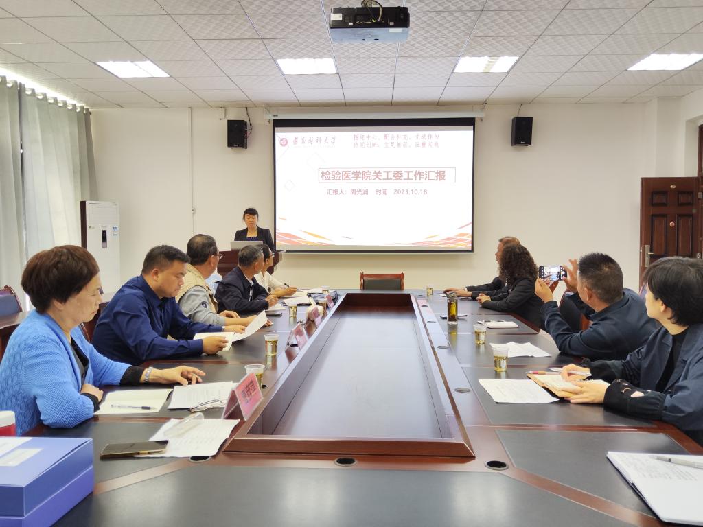 2023年10月18日上午10:00,遵义医科大学关心下一代工作委员会对检验医学院落实学校创建“五好关工委”工作推进情况进行了中期检查。会议在新蒲校区检验医学院会议室召开。检查组四组组员、学校关工委常务副主任李实明、检查组四组组员、学校关工委副主任顾土龙、检查组组员、组织部副部长柏正华、检查组秘书邵丽出席本次中期检查会议。会议由检验医学院党委书记周光润主持。