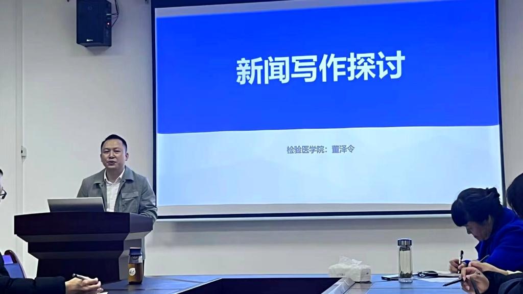 为进一步提升遵义医科大学检验医学院通讯员、教职工及学生干部的新闻理论素养和新闻写作水平,构建一支善于发现、撰于业务,扬我遵医风貌的常态化通讯员队伍。检验医学院于2023年11月16日19:00在学院2-508会议室举办了新闻写作专题培训。本次培训特邀检验医学院/科通讯员董泽令老师授课。学院办公室、教务科工作人员、各党支部书记、学院网络宣传员、网络评论员、院团委学生会主要负责人及宣传部门成员、各班团支书、宣传委员近50人参会。检验医学院党委书记周光润主持培训会。