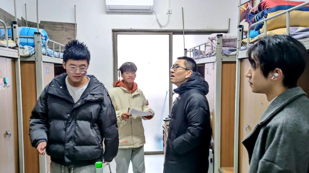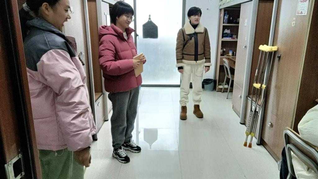 学院从寝室用电安全、管制刀具排查、寝室卫生保洁、学生文明礼貌等方面对全院寝室检查评分,对于发现的问题当场指出,并要求学生立即整改。查寝中,老师们反复提醒学生注意冬季防寒防冻,防范电信网络诈骗,指导同学们整理内务、合理使用空调,对学生提出的问题耐心解答。