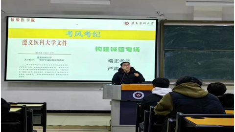 罗治宇副书记首先向学生们通报了春季学期期末考试中某考场54名学生因考试违纪受到学校处分的有关情况,然后带领学生学习《中华人民共和国宪法》《中华人民共和国教育法》《中华人民共和国高等教育法》《普通高等学校学生管理规定》及《遵义医科大学考试管理与违纪处分办法》。并通过系统梳理,为学生理清违纪处分的法理源头。同时,用此次违纪案例“以案释法”,让学生清醒认识到受到违纪处分后将对学位授予、升学、就业和未来职业发展造成负面影响。他要求全体学生要努力学习,在考场上一定要克服侥幸心理,从诚信考试做起,严格遵守国家法律和校规校纪,为成为一名合格的社会主义医疗卫生事业接班人而不懈奋斗。