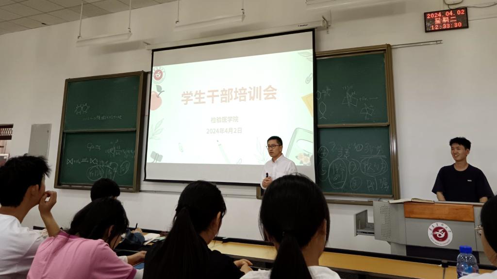 为提高学院学生干部政治素养、工作能力,以及辨别网络有害信息的能力,检验医学院于2024年4月2日中午12:30在新蒲校区第十三阶梯教室召开全院学生干部培训会。会议由学院党委副书记罗治宇主持,学院全体学生干部以及辅导员参加了会议。