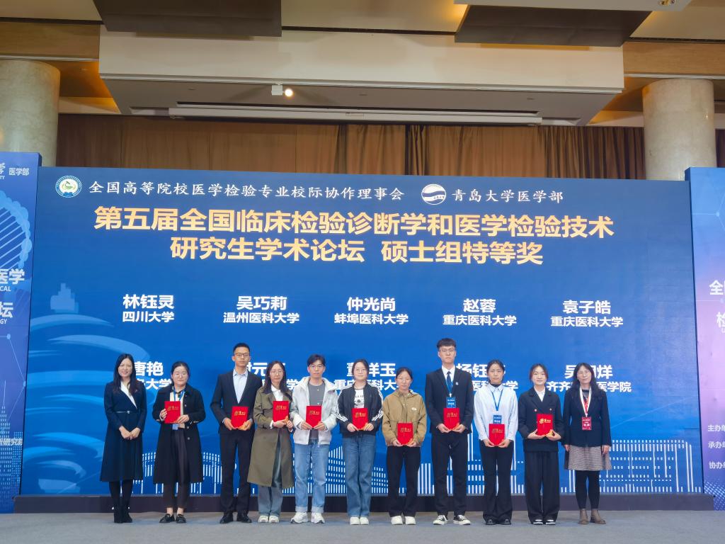2024年4月12日-15日,《第五届全国临床检验诊断学和医学检验技术研究生学术论坛》在青岛召开。会议由全国高等院校医学检验专业校际协作理事会主办,青岛大学医学部、青岛大学再生医学与检验创新研究院承办。本次会议由遵义医科大学检验医学院副院长(主持工作)闵迅教授带队,副院长杨艳教授、临床微生物与免疫检验教研室副主任黄健教授、医学检验学实验室副主任段晓雷博士以及硕士、博士研究生一行10余人共同参加了本次盛会。据悉,本次论坛共暂获特等奖1项、二等奖4项、三等奖1项。