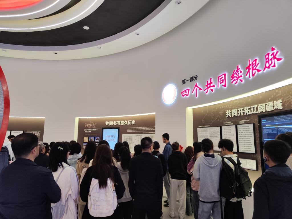 在体验馆内,同学们深入学习了习近平总书记关于加强和改进民族工作的重要思想,沉浸式体验了中华民族“四个共同”根脉展览,以及遵义市在铸牢中华民族共同体意识示范试点工作方面的生动实践。随后,大家一同参观了铸牢中华民族共同体意识主题公园。在这里,周光润书记以《榜样的力量:三千孤儿入内蒙,草原母亲都贵玛》为题,给同学们上了一堂党课。