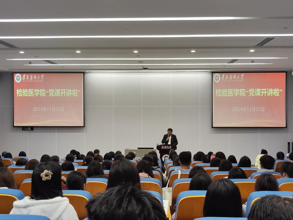 11月23日上午,检验医学院党委在学校图书馆三号报告厅举办了“党课开讲啦”宣讲活动。检验医学院、麻醉医学院、医学影像学院党委主要负责同志出席本次活动。三个学院的党支部书记、辅导员、全体学生党员、发展对象以及入党积极分子代表参加活动。活动特别邀请了遵义市长征学学会副会长、遵义医科大学党委原副书记田宗远和检验医学院原党委书记罗开源主讲。