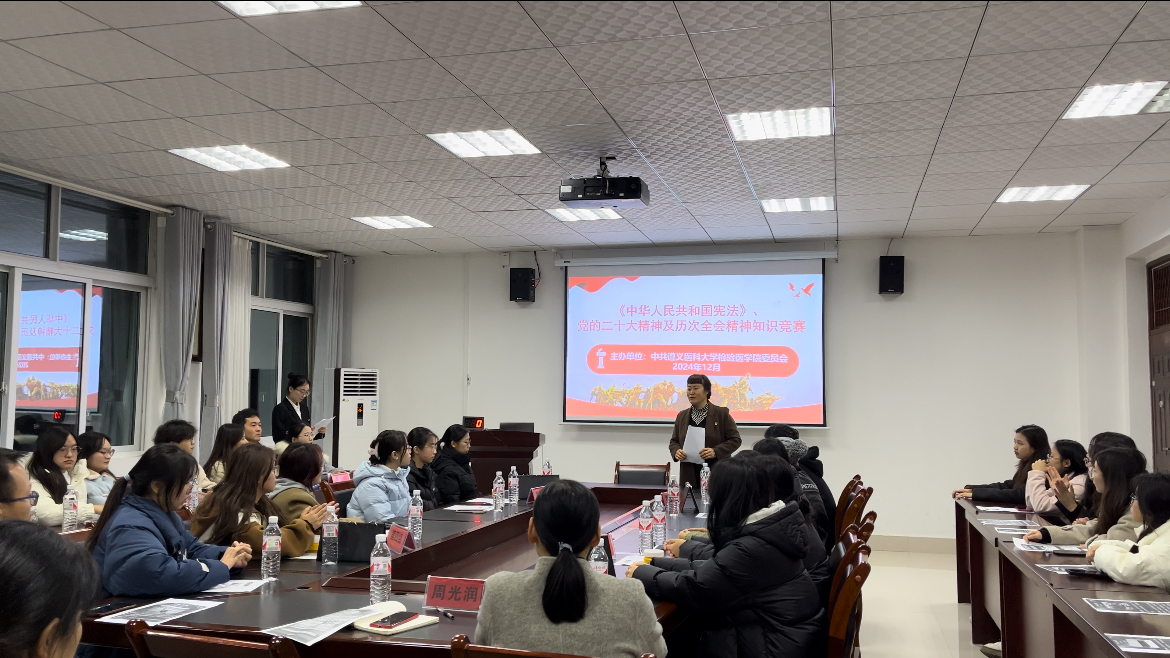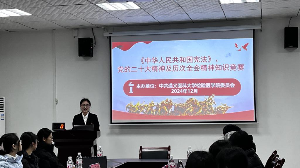 2024年12月6日,检验医学院党委在新蒲校区2号实验楼检验医学院会议室举办了《中华人民共和国宪法》、党的二十大精神及历次全会精神知识竞赛。检验医学院党委书记周光润、学生第二党支部书记张增平、各支部学生党员代表、入党积极分子代表参加本次活动。