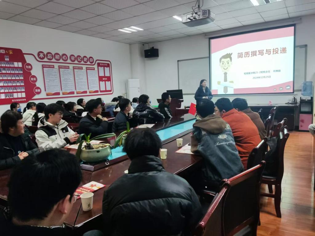 2024年12月26日,在第一附属医院检验科会议室,到访老师与实习同学开展座谈交流,了解同学们的学习、生活与就业意向,并开展就业引导与征兵政策宣讲工作,鼓励学生积极报名参军。周光润书记询问学生实习状况、听取实习收获,鼓励学生端正心态、踏实工作,发扬吃苦耐劳精神,随后,何燕丽老师对实习生开展了题为《简历撰写与投递》的就业指导培训,以提升同学们的求职能力。最后,老师们走访了学生寝室,周书记教育同学们在实习过程中注重调节自身情绪、保持身心健康,并强调用电安全。