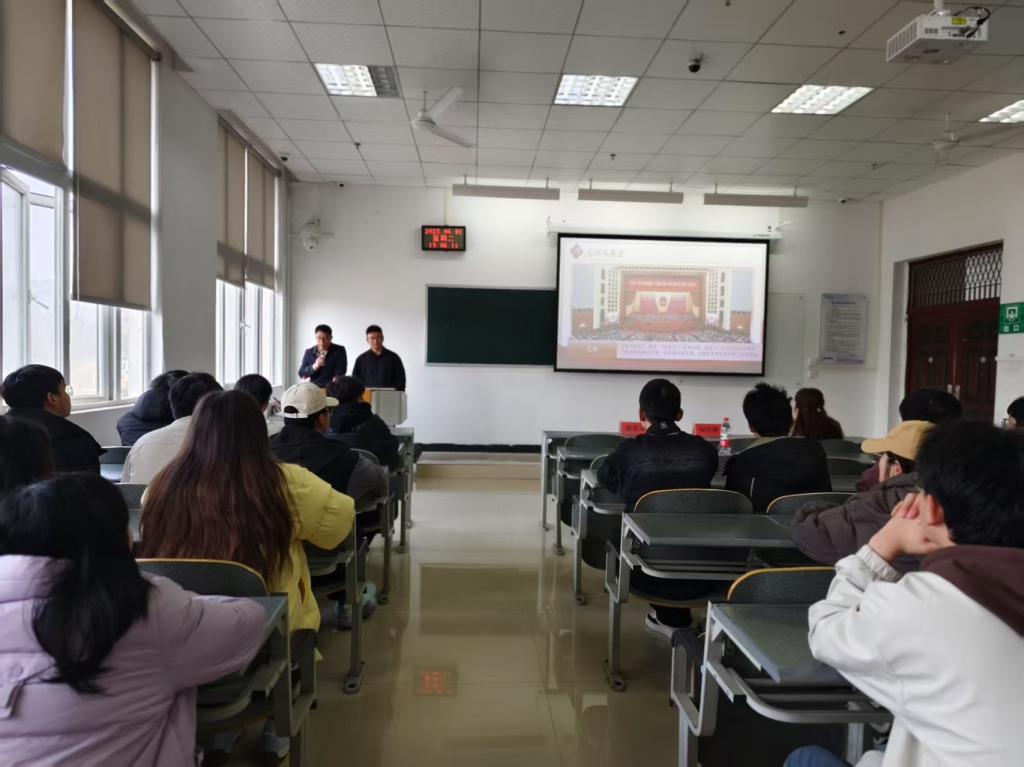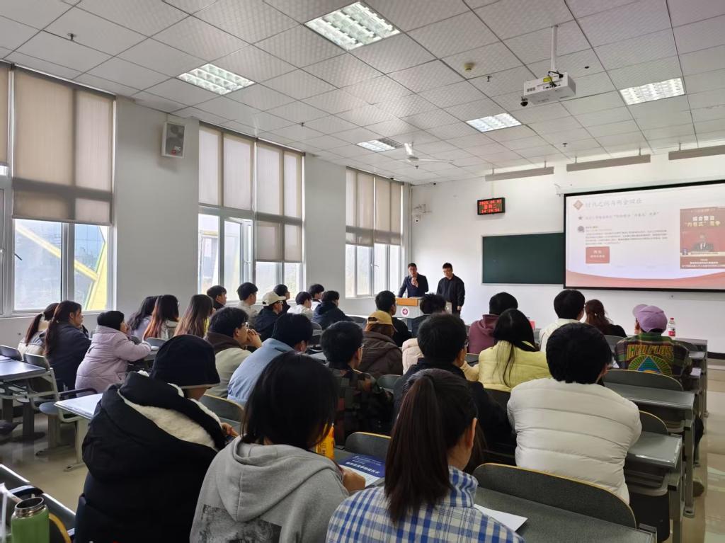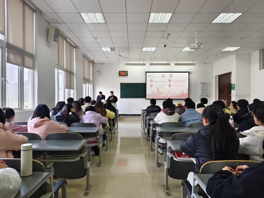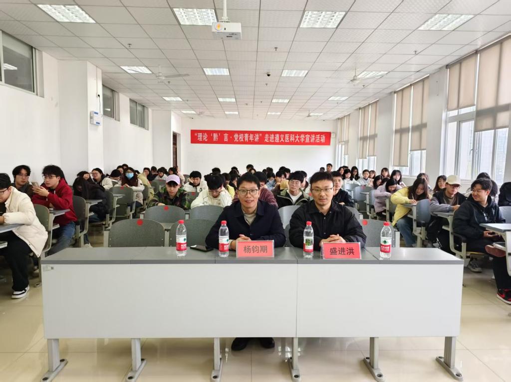 为深入学习贯彻习近平新时代中国特色社会主义思想,扎实推进党的创新理论"三进"工作,2025年4月1日,中共贵州省委党校讲师团成员、贵州师范大学马克思主义学院教授杨钧期、盛进洪同志赴遵义医科大学检验医学院,联合开展“理论‘黔言’·党校青年讲”(理论宣传二人讲)专题宣讲活动。活动以“打破内卷困局,重塑竞争新生态”为题宣讲2025年全国两会精神。学院党委书记周光润、副书记罗治宇、全体专职辅导员和22级学生共150余人参加活动。