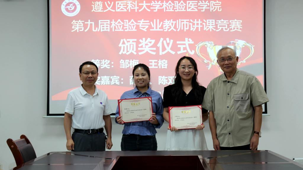 经过激烈角逐,遵义医科大学附属医院邹梅老师、遵义医科大学第二附属医院王榕老师荣获一等奖;遵义医科大学附属医院闵昌航老师、遵义医科大学第三附属医院陈相好老师荣获二等奖;遵义医科大学第二附属医院蒋丽、遵义医科大学附属医院张皖婷、安顺市人民医院邓渊、贵州茅台医院杨朝莲4位教师荣获三等奖;杨隆兵等4位教师荣获鼓励奖。获奖教师代表邹梅、王榕表示:“作为一名检验新人能够获得本次竞赛一等奖,既是对自己入职以来在教学工作方面的肯定,更与检验院科领导精心搭建竞赛平台、导师团队悉心指导密不可分”。