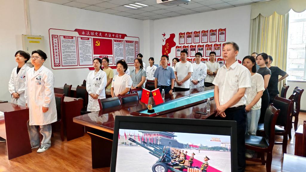 当天上午,检验科的工作人员们提前抵达会议室,怀着无比崇敬的心情静候大会的启幕。9时许,庄严的国歌在天安门广场上空奏响,全体工作人员即刻肃然起立,齐声高唱国歌,歌声中饱含对祖国的深厚热爱和对先烈的深切缅怀。