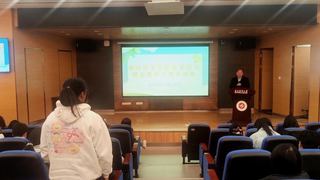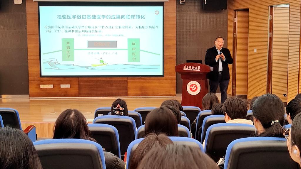 鄢盛恺教授以其参与全国高等医药院校医学检验技术专业第五轮固化教材再版修订工作的经历为切入点,深入剖析医学检验技术专业的未来发展,重点围绕“深化产学研用合作,培养高素质复合型检验医学人才”这一核心主题进行论述。鄢教授系统梳理了检验医学的发展历程与行业现状,深刻分析了当前及今后一段时间,行业所面临的机遇与挑战。他强调,医学检验技术专业本科学生要立足专业基础,拓宽学术视野,主动融入学科交叉融合的大趋势,注重临床实践能力与科研创新素养的双重提升。他勉励同学们珍惜大学时光,树立终身学习理念,积极参与科研项目与校企合作实践,努力成长为具备国际视野、责任意识和创新精神的高素质复合型检验人才,为健康中国建设贡献专业力量。