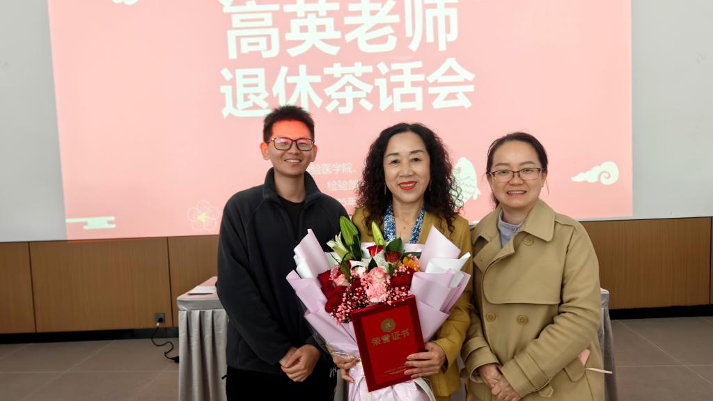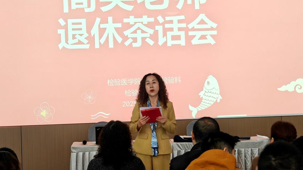 最后,检验医学院副院长、附属医院检验科副主任杨艳教授为高英老师颁发了“光荣退休证”,并代表科室表达了慰问之情。高英老师对部门工会精心组织的茶话会表示衷心感谢,并预祝检验医学院(科)建设更加美好。