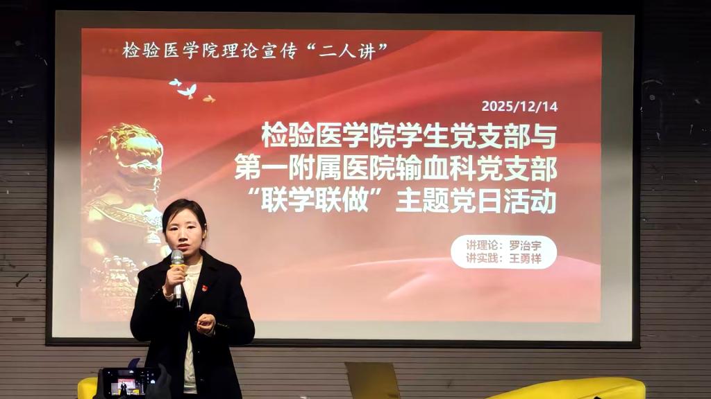 2025年12月14日上午10时,检验医学院在新蒲校区师生活动中心开展“理论宣传二人讲”暨学生党支部与第一附属医院输血科党支部“联学联做”主题党日活动。活动由检验医学院党委副书记罗治宇主持、讲理论,学院教务科副科长王勇祥博士讲实践,第一附属医院输血科党支部书记黄美容作交流发言。学院全体师生党员、入党积极分子和第一附属医院输血科党支部部分党员参加了活动。