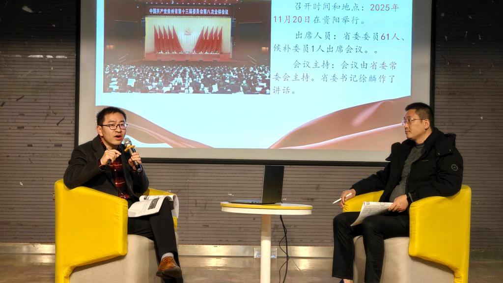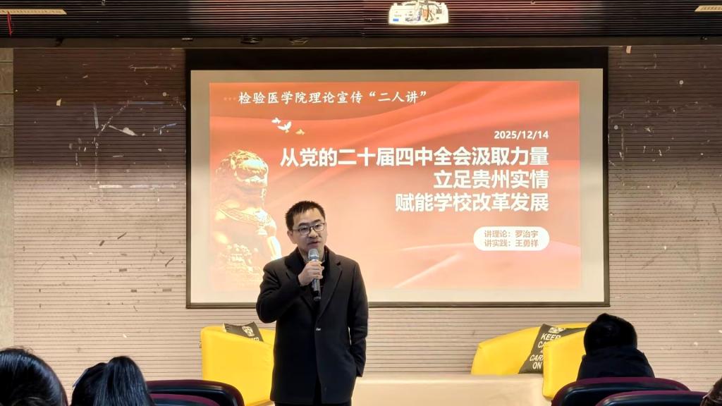 罗治宇副书记首先宣讲了中国共产党第二十届中央委员会第四次全体会议精神,重点解读《中共中央关于制定国民经济和社会发展第十五个五年规划的建议》的核心要义。他从宏观历史视角出发,回顾了改革开放以来我国的现代化战略安排与“两个一百年”奋斗目标的递进脉络,阐释了“十五五”时期承前启后的历史地位。随后,他将视角聚焦到贵州与学校自身发展,介绍了中国共产党贵州省第十三届委员会第八次全体会议和中国共产党遵义医科大学第二次党员代表大会的概况,重点解读了贵州省在“十五五”时期经济社会发展主要目标和学校未来五年的发展目标,引导同学们着重思考,如何将个人成长融入区域发展和学校事业进步的进程中。